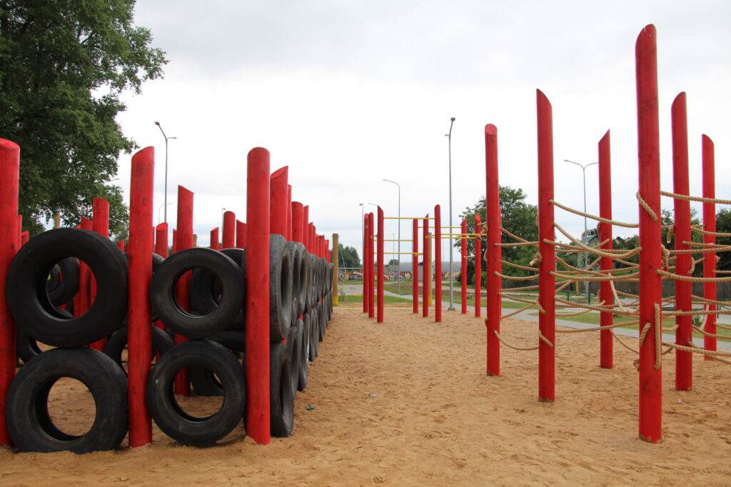 Основными материалами площадки стали старые автомобильные шины, пожарные шланги и спилы деревьев. Это не только снизило стоимость, но и дало вторую жизнь бросовым материалам. Шины, например, используются для лазания и отталкивания, а дерево — для создания природной эстетики.