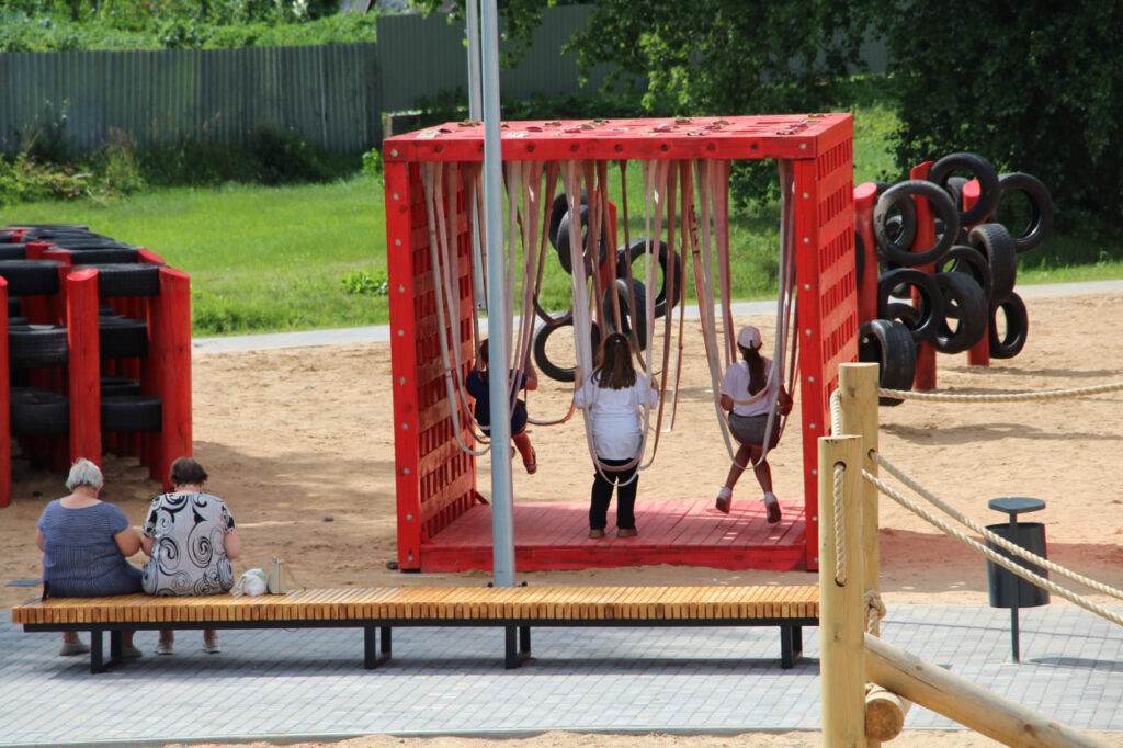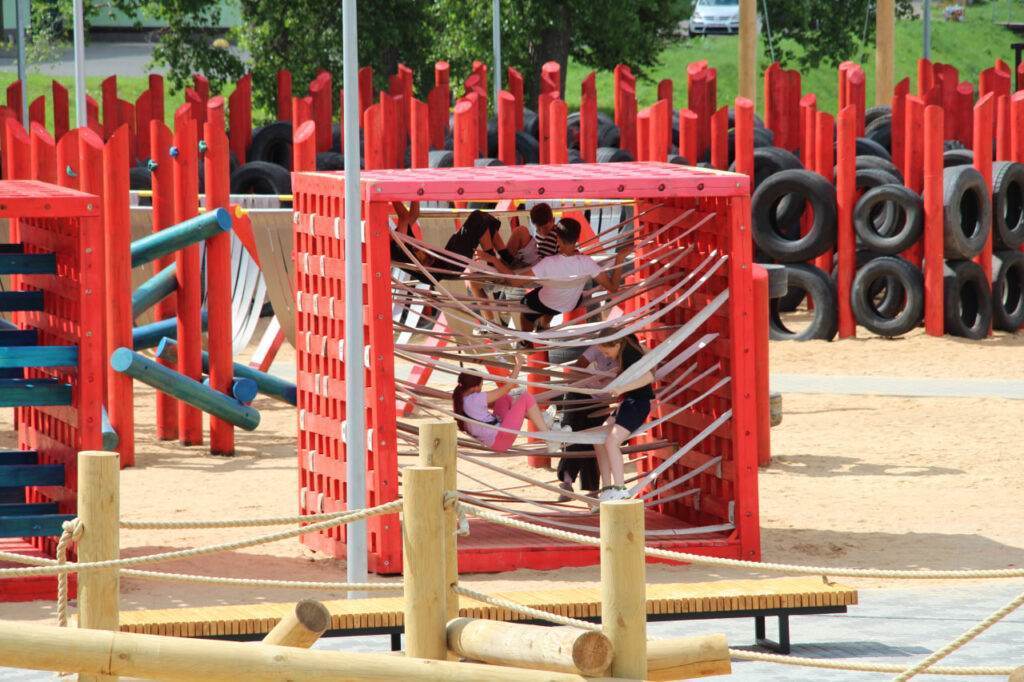 Важная особенность — тренажеры, замаскированные под игровые элементы. Они развивают разные группы мышц, вестибулярный аппарат и координацию, но происходит это исподволь, незаметно для самих подростков. Например, есть элементы, где нужно подтягиваться, отжиматься или балансировать. Конструкция продумана до мелочей.