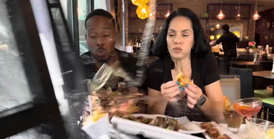 Блогеры Нина Сантьяго и Патрик Блэквуд неожиданно для самих себя стали героями вирусного видеоролика, в котором, как будто по сценарию голливудского боевика, попали в аварию, находясь прямо в ресторане.