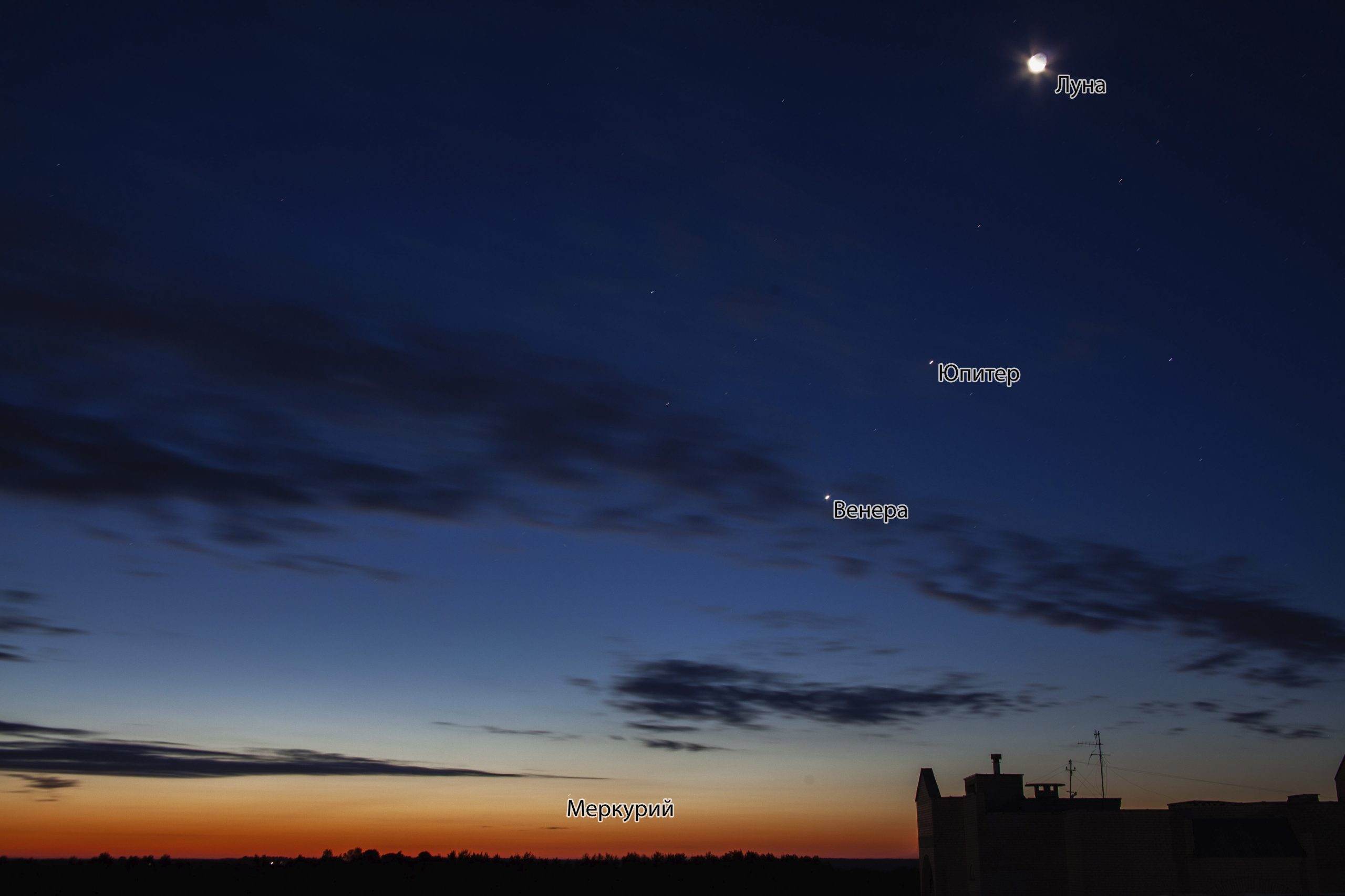 В одну линию выстроились едва различимый Меркурий, Венера, Юпитер и Луна. К слову, земной спутник «забежал на огонек» только на один день и уже завтра покинет строй, сместившись к Венере и Юпитеру.