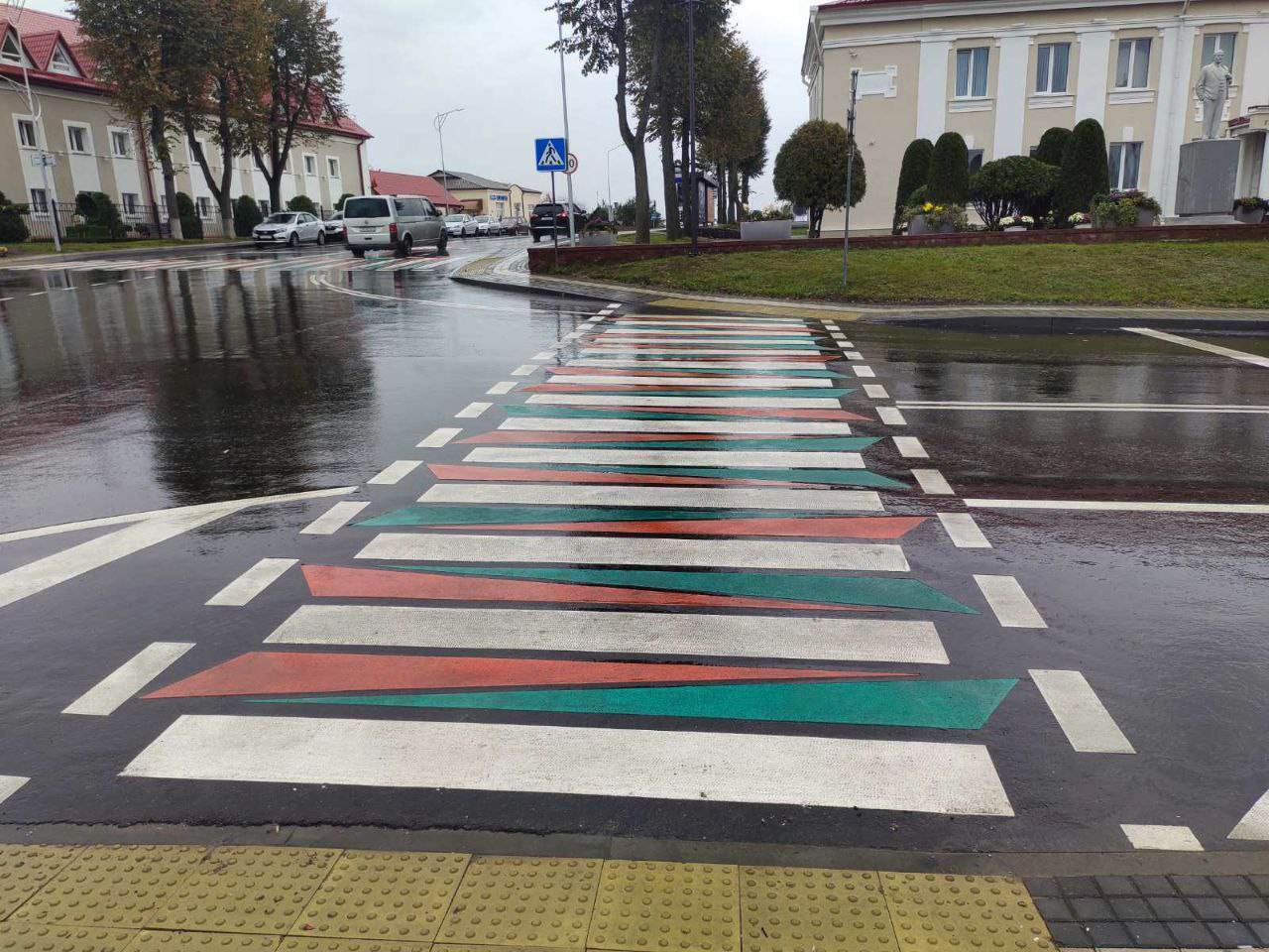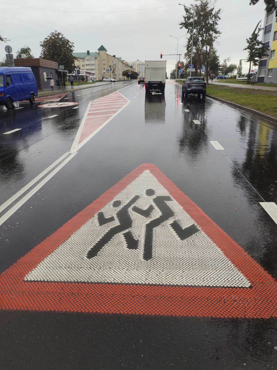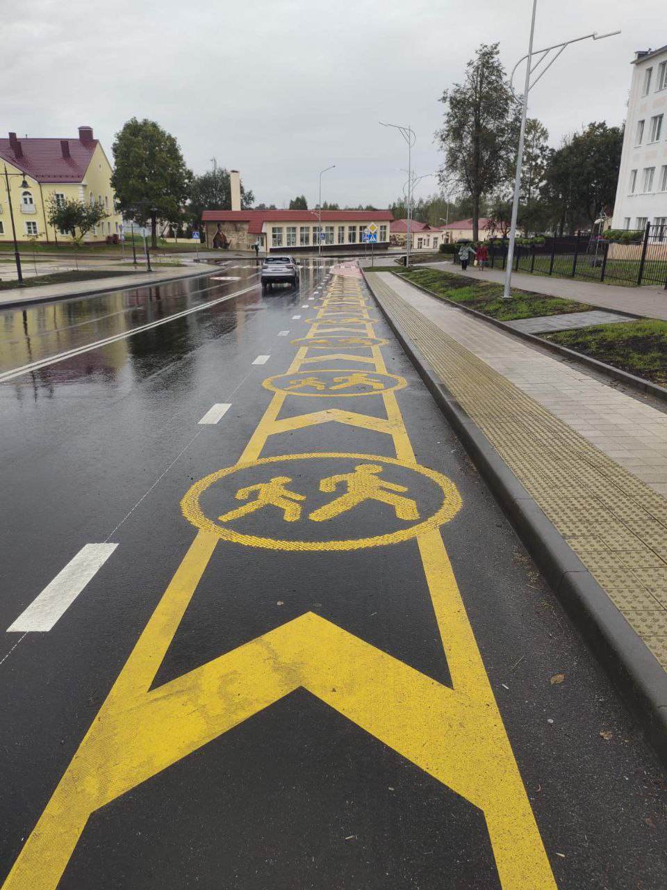 Новшеством стала желтая разметка зоны посадки и высадки детей у школ, а также красная окантовка пешеходных переходов. Все эти элементы были нанесены с помощью стимографа — специального дорожного принтера, который автоматически создает изображение на асфальте.